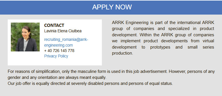 We would like to inform you that due to data protection, we can only accept your application via our online application platform. In order to be able to review your application, we would therefore ask you to apply on our careers page with just a few clicks: https://arrkeurope.onlyfy.jobs/job/f8w6g8ep