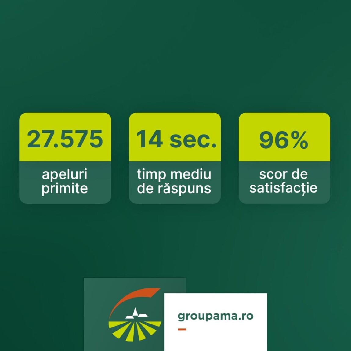 În luna august, în call center-ul Alo Groupama s-au înregistrat 27.575 de apeluri primite. Colegii noștri au răspuns în medie în mai puțin de 14 secunde ⏱️, iar scorul de satisfacție a clienților a fost de 96%. 🌟